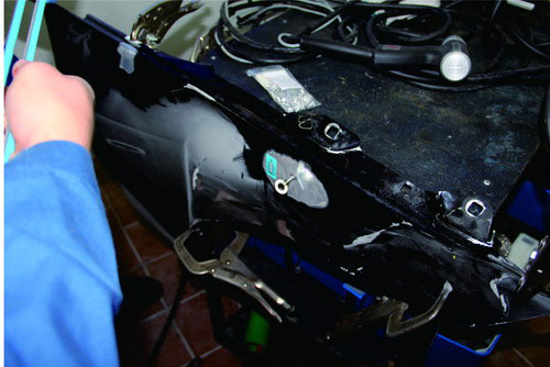 在鋁質面板修復時,也可使用鋁整形機對損傷部位進行拉伸修復,在經整形機修復到位后,使用專用工具將螺紋介子齊根剪下,再打磨平整即可。對于鋼板車身來說,當面板和內層結構同時發(fā)生變形時,可以采取內外層分離、分別修整,然后折邊咬合的修復方法。對于鋁質面板,不能使用這種方法,否則由于鋁的韌度較差,折邊部位會出現(xiàn)裂紋或斷裂。