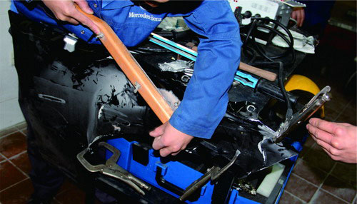 對鋁板的修復,為了防止在校正中因敲擊過重而導致鋁板過度拉伸,一般應使用膠錘、木錘,不能使用常規(guī)的鋼板整形工具。用鐵錘和墊鐵校正鋁板時,應注意以下兩點: