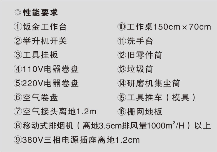 損傷修復和焊接作業區域可各設置 4~6個工位,每個工位的面積約400cm×800cm,每個工位配相應的設備和操作臺(架)。車身校正作業一般設一個工位,面積500cm×800cm。如條件允許,可以根據不同類型的校正架,設置2~3個工位。
