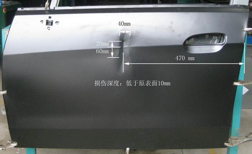 2013年車身修復(fù)大賽受損門板修復(fù)項(xiàng)目技術(shù)方案的補(bǔ)充說明 2013-05-16 18965 2013年車身修復(fù)大賽受損門板修復(fù)項(xiàng)目技術(shù)方案的補(bǔ)充說明 1、受損門板項(xiàng)目的受損位置及尺寸圖片、作業(yè)要求(1)作業(yè)要求在40分鐘內(nèi),對(duì)雪佛蘭新賽歐左前門外板上的長(zhǎng)80mm,寬40mm,深10mm的條形凹陷(漆膜已破壞)進(jìn)行修復(fù),凹陷損傷穿過車身線。