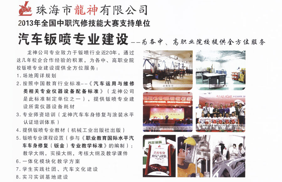龍神汽車車身修復(fù)與涂裝 水平認(rèn)證培訓(xùn)體系 2013-06-03 25192 龍神公司專業(yè)致力于鈑噴行業(yè)近20年,通過這幾年校企合作經(jīng)驗(yàn)的積累,為各中、高職業(yè)院校鈑噴專業(yè)建設(shè)提供全方位服務(wù)。