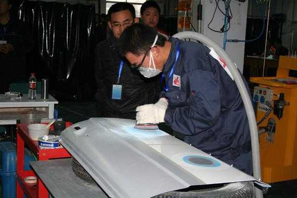 參賽選手利用龍神公司提供的鈑噴設(shè)備進(jìn)行實(shí)操