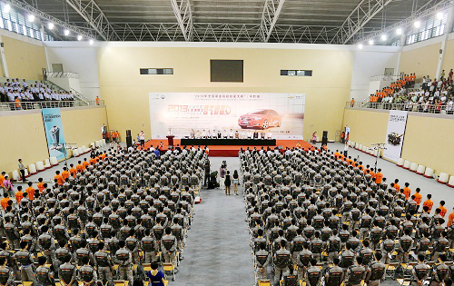 6月20日上午,2013年全國職業(yè)院校技能大賽中職組“雪佛蘭杯”汽車運用與維修技能大賽開幕式在無錫汽車工程中等專業(yè)學校體育館舉行。交通運輸部道路運輸司王水平副司長、江蘇省教育廳楊湘寧副廳長、無錫市人民政府華博雅副市長、大賽主贊助商——上海通用汽車有限公司黨委書記黃強出席開幕式并致辭。裁判員代表洪永楠、參賽選手代表何宇先后宣誓。大賽開幕式由國家教育部職成教司農(nóng)村教育處劉杰處長主持。