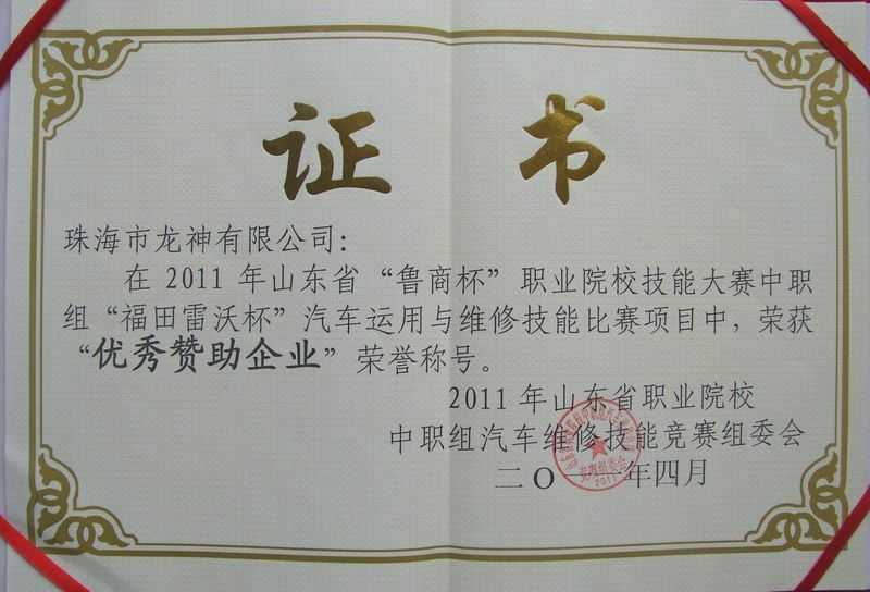 4月7日,在「2011年山東省“魯商杯”職業(yè)院校技能大賽」中職組“福田雷沃杯”汽車運用與維修技能大賽項目中,我司榮獲“優(yōu)秀贊助企業(yè)”榮譽(yù)稱號。