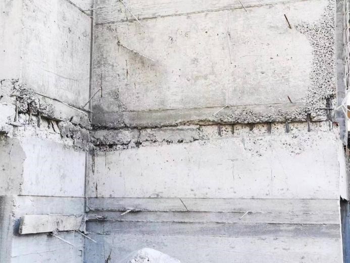 據(jù)上述建筑不遠處有一棟在建10層建筑(圖3),形狀不太規(guī)則,可以看到墻肢底部的彎曲型破壞和連梁的破壞(圖4、圖5),上部結(jié)構(gòu)未觀察到損傷,整體結(jié)構(gòu)依然站立。
