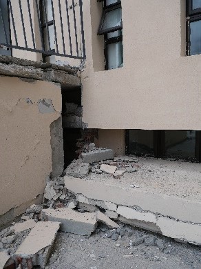 瀘定線科考組(曲哲、朱柏潔)主要考察了位于八度和九度區(qū)的磨西鎮(zhèn)典型建筑地震損傷情況,包括典型的隔振結(jié)構(gòu)、木結(jié)構(gòu)、底框結(jié)構(gòu)等。如甘孜某學(xué)校行政樓,為框架結(jié)構(gòu)底部隔震建筑,采用隔震支座附加油阻尼器的設(shè)計,在地震中上部結(jié)構(gòu)整體發(fā)生了平移,底部隔震層位移明顯,震后隔震支座完好,部分阻尼器損傷。杉樹鎮(zhèn)的底框結(jié)構(gòu),典型破壞特征為首層柱傾斜,上部磚墻交叉裂縫,一些非結(jié)構(gòu)構(gòu)件發(fā)生破壞。部分砌體結(jié)構(gòu)建設(shè)在山坡上,基礎(chǔ)局部失效,使得上部結(jié)構(gòu)震害較重。同時瀘定線科考組還前往燕子溝地震臺,查看了儀器情況。