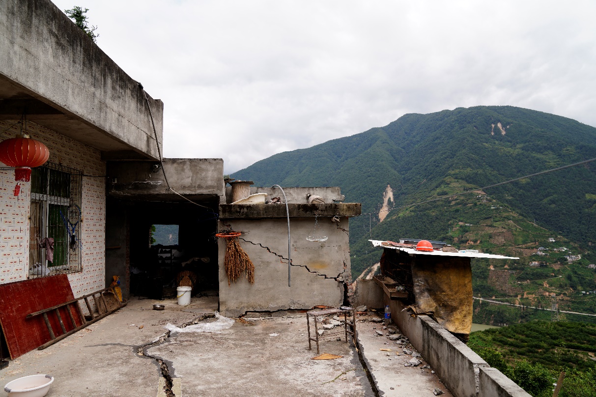 石棉線科考組(戴君武、周寶峰、柏文)圍繞51SMX,SC-T2471,51SMM等強震臺站,開展周邊建筑震害調(diào)查。SC-T2471臺站在本次地震中記錄到的加速度記錄峰值最大,現(xiàn)場考察發(fā)現(xiàn)該臺站位于山包之上,地形對其地震響應(yīng)具有較為明顯的放大作用。此外,地基失效是造成房屋破壞的重要原因,由于山地地形限制,部分民房建于山坡上,地震時結(jié)構(gòu)基礎(chǔ)土體沿山坡向下發(fā)生滑動,造成基礎(chǔ)局部失效,進而引起上部結(jié)構(gòu)破壞。