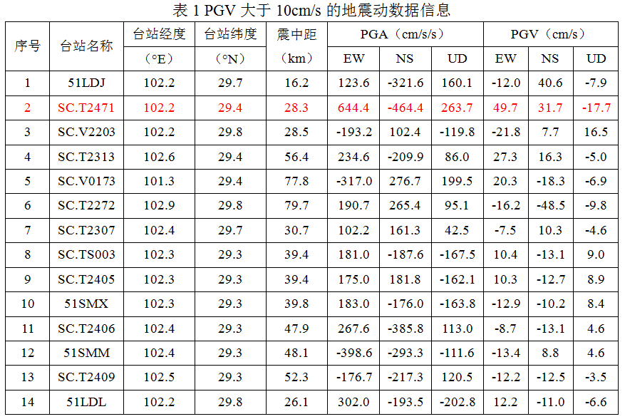 和歷史地震相比,本次地震記錄到的地震動PGV/PGA明顯偏大。2008年汶川8.0級地震臥龍臺站記錄到的地震動PGA為957.7cm/s2,PGV為51.7cm/s。2019年四川宜賓長寧地震珙縣中學臺站記錄到的地震動PGA為600cm/s2,PGV為12.6cm/s。本次地震,記錄到的最大地面加速度峰值PGA為644.4cm/s2,PGV高達49.7cm/s,與汶川地震臥龍臺站記錄到的PGV值十分接近,可見此次地震的破壞能量之大。