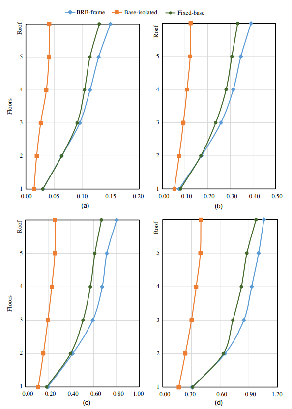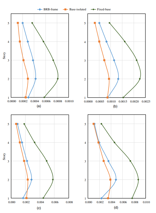 2)結(jié)構(gòu)響應(yīng)分析結(jié)果(圖2)顯示,與普通框架結(jié)構(gòu)相比,BRB-框架結(jié)構(gòu)與隔震結(jié)構(gòu)在各個(gè)強(qiáng)度等級(jí)的地震下層間位移角均降低了40%-60%;隔震結(jié)構(gòu)的頂層樓層加速度降低了45%,而B(niǎo)RB-框架結(jié)構(gòu)頂層的樓層加速度增大25%。