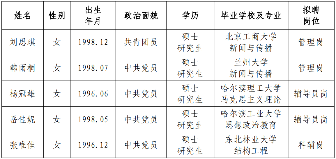 發(fā)布時(shí)間: 2022-03-28 點(diǎn)擊數(shù)量:10594根據(jù)中國(guó)地震局《關(guān)于貫徹執(zhí)行<事業(yè)單位公開(kāi)招聘人員暫行規(guī)定>的通知》文件精神和我所用人計(jì)劃,經(jīng)公開(kāi)發(fā)布招聘信息、資格審查、面試等程序確定擬錄人員。現(xiàn)將擬錄人員相關(guān)情況公示如下,公示期7天,期間如有異議請(qǐng)與中國(guó)地震局工程力學(xué)研究所人才資源部或紀(jì)檢室聯(lián)系,以個(gè)人名義反映情況的須署真實(shí)姓名,以單位名義反映情況的須加蓋公章。